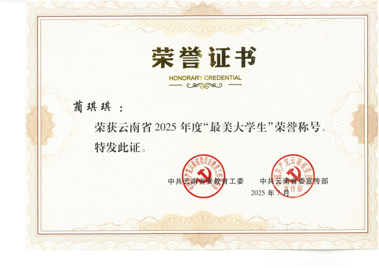 云中讯(学工部)近日,中共云南省委教育工委、省委宣传部公布了《2025年度云南省最美大学生推选结果的通知》,米乐第一临床医学院2020级佩衡班蔺琪琪同学荣获“最美大学生”称号。