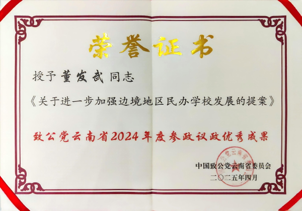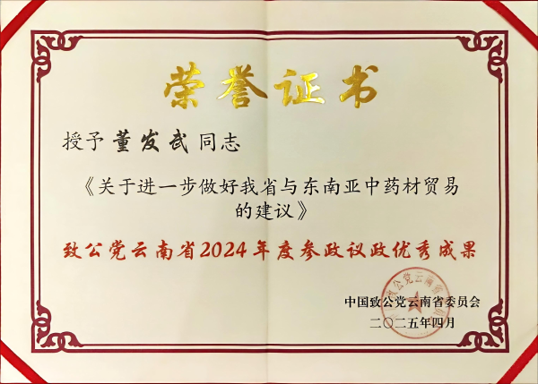 云中讯(统战部)近日,米乐致公党支部主委董发武教授《关于进一步做好我省与南亚东南亚中药材贸易的建议》《关于进一步加强边境地区民办学校发展的提案》两项成果,被致公党云南省委员会授予致公党云南省2024年度参政议政优秀成果奖。