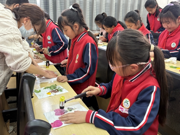 在“中药香囊DIY”环节,志愿者带领孩子们辨识藿香、樟木子、白芷等中药材。硕士生党员杨睿瑶向孩子们讲解中药材功效与配伍知识,指导他们亲手制作驱蚊防虫香囊。周云欣等佩衡班学子指导孩子们将新鲜的艾草、紫苏叶、马齿苋等中草药通过非遗“植物拓染”技艺捶印在纸片上,创作出独一无二的中药植物书签。这一过程既锻炼了动手能力,也潜移默化传递了中医“天人合一”的自然观。西冲小学唐华茂主任表示:“这种理论+实践的活动设计,既贴合小学生的认知特点,又让中医药和非遗文化在孩子心中“活”起来,是难得的优秀传统文化传播形式,希望以后能多开展此类活动。”