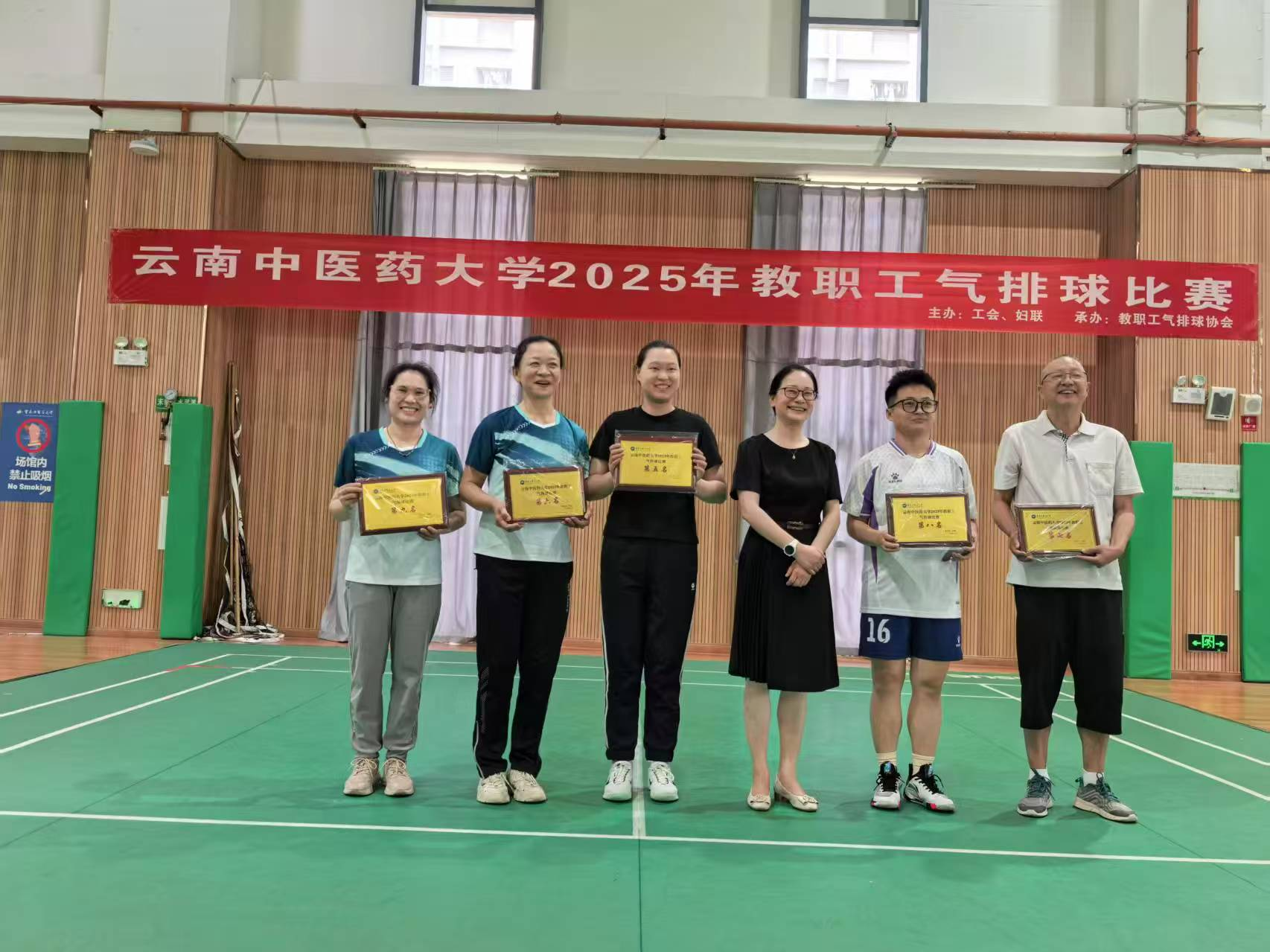 云中讯(校工会)为深入贯彻习近平总书记关于健康中国建设的重要论述精神,积极响应全民健身号召,进一步丰富校园文化生活,6月9日至17日,学校在呈贡校区二期体育馆举行第十二届教职工“快乐杯”气排球比赛。本次比赛由校工会妇联主办,学校气排球协会承办,来自全校11个二级工会的14支参赛队同场竞技,离退休队应邀参赛,参赛教职工近200名。校党委副书记、校工会妇联主席祁苑红参加闭幕式。