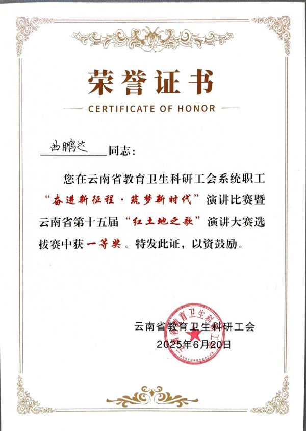 云中讯(工会)6月20日,在云南省教卫科工会职工“奋进新征程 筑梦新时代”演讲比赛暨云南省第十五届“红土地之歌”演讲大赛选拔赛中,米乐护理学院教师曲鹏达,以《把论文写在云岭大地上》为题参赛,荣获一等奖。共有48家单位参加此次比赛。