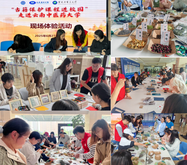 讲座之余,翰墨楼二楼大厅内在同步开展沉浸式文化现场体验活动,活动现场有百余名师生参与到非遗传拓技艺、古籍线装书制作、《滇南本草》香囊制作等妙趣横生的实践体验中来,师生们热情洋溢地加入其中,让古籍保护从理论知识转化为鲜活实践,充分诠释着对中华优秀传统文化的浓浓情意。