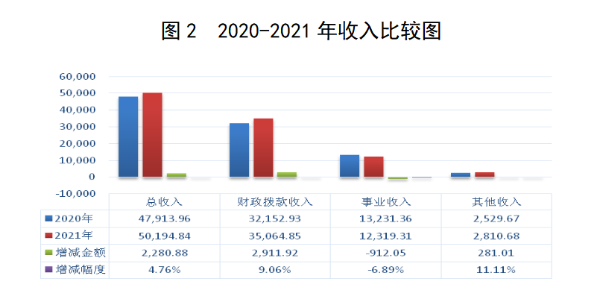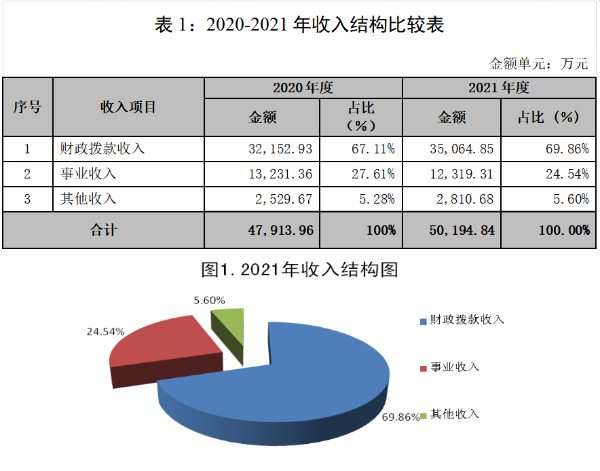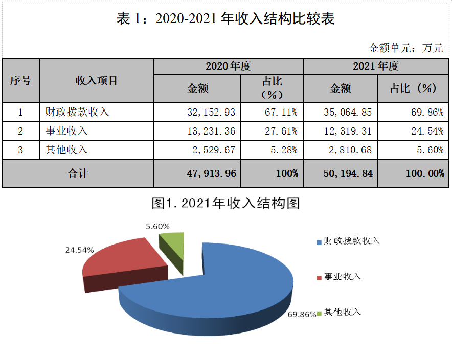 米乐mile官方网站2021年度收入合计50,194.84万元,较上年47,913.96万元增加2,280.88万元,增幅为4.76%。其中:财政拨款收入35,064.85万元,占总收入的69.86%;上级补助收入0.00万元,占总收入的0.00%;事业收入12,319.31万元(含教育收费10,030.18万元),占总收入的24.54%;经营收入0.00万元,占总收入的0.00%;附属单位缴款收入0.00万元,占总收入的0.00%;其他收入2,810.68万元,占总收入的5.60%。
