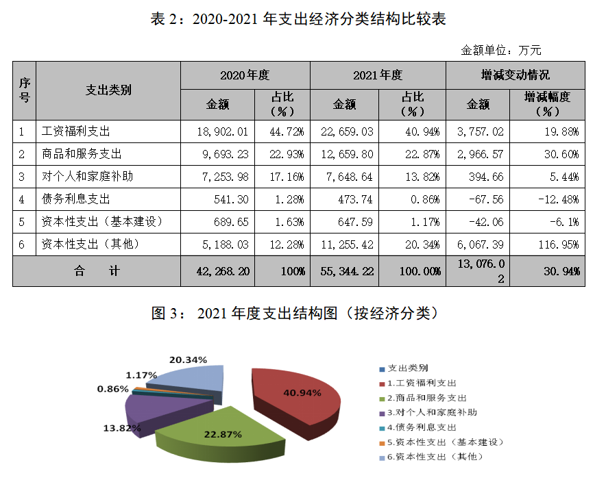 如图表所示,本年度支出占比最大的是人员支出(包括工资福利支出和对个人和家庭补助),共计30,307.67万元,占比54.76%。