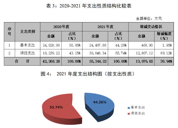 米乐mile官方网站2021年度支出合计55,344.22万元,较上年42,268.20万元增加13,076.02万元,增幅为30.94%。增加的原因为:一是项目支出增幅较大主要为完成2021年6,500.00万元的化债目标任务及各部门协同对项目实施“全过程”跟踪管理有效促进了项目支出的预算执行;二是为保障学校正常运转必要的基本支出小幅增加。其中:基本支出24,497.88万元,占总支出的44.26%;项目支出30,846.34万元,占总支出的55.74%。