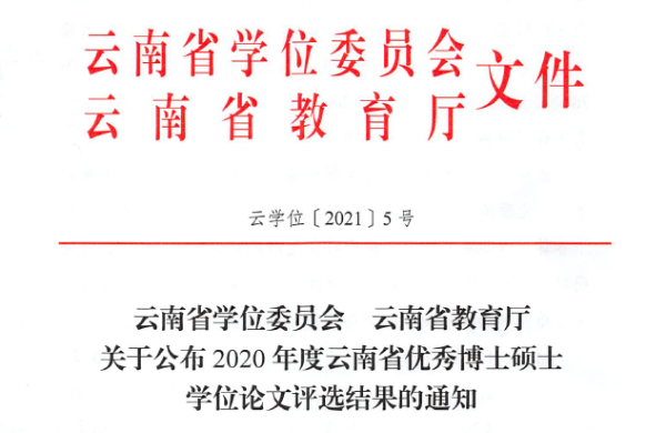 据《云南省学位委员会 云南省教育厅关于公布2020年度云南省优秀博士硕士学位论文评选结果的通知》,米乐有4篇硕士学位论文被评为2020年云南省优秀硕士学位论文。具体获奖名单如下: