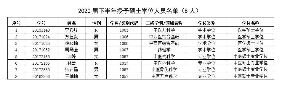 根据学校《硕士学位授予工作细则(2011年4月修订)》(云中院字[2011]31号)的规定,经2020年12月8日校学位评定委员会全体会议审议,现对2020届下半年硕士研究生方钰发等8人硕士学位授予名单进行公示(详见下表)。