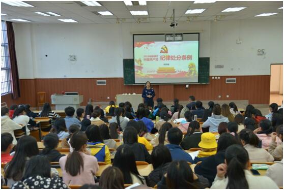 云中讯(通讯员 田桂兰 吴淑昆)11月27日中午,护理学院党委书记、院长毕怀梅在弘毅楼1111教室讲廉政党课。此次党课主题为“2018年新修订《中国共产党纪律处分条例》(以下简称《条例》)”解读,护理学院全体党员、发展对象和入党积极分子200余人参加了会议。