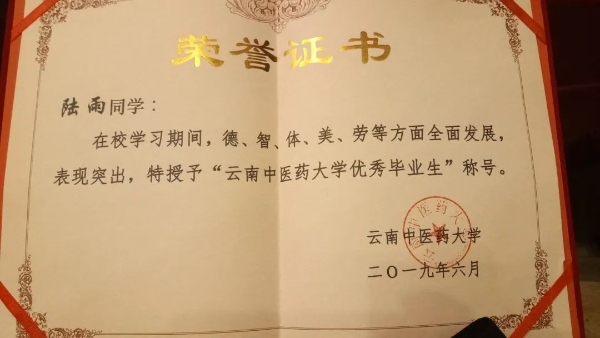 陆雨来自云南省曲靖市富源县农村,家庭人口多且爷爷奶奶都已是耄耋之年,她读大学无疑给父母增加了更多压力。在办理了助学贷款后,她一边在学校勤工助学岗位上工作,一边勤学苦读,同时积极申请入党。通过多次党课培训,陆雨对党的理论和认识不断加强,她积极主动和同学交流,定期向老师汇报思想以及学习情况,展开自我批评,并改正自己的错误和缺点,提高自己的思想觉悟,努力向党组织靠拢,于2018年12月1日成为一名正式的中共党员。