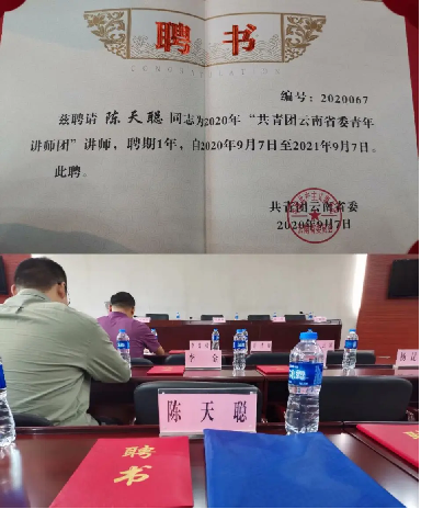 2019年秋季学期,陈天聪参与了昆明市呈贡区2019年度新兵役前集训,受到呈贡区征兵办表彰,获评“优秀教练员”称号。送兵结束后,他匆忙赶回学校,承担了米乐mile官方网站的军训任务,带队学校的擒敌拳方阵,被授予“优秀教官”称号,还被聘为“共青团云南省委青年讲师团讲师”。