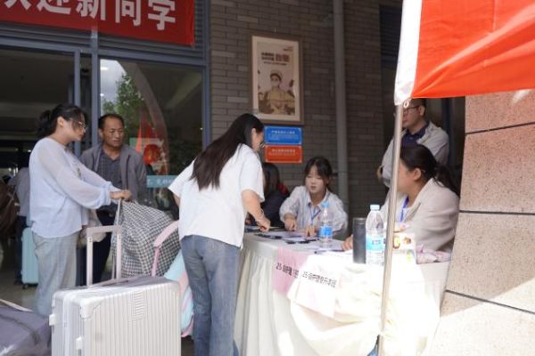 为避免新生在校园内往返奔波,学校统筹各学院结合宿舍分布,在一期紫竹苑、银杏苑、金桂苑及二期景天苑、熟地苑宿舍楼下,分别设置了对应学院的迎新点。每个迎新点都悬挂着醒目的学院标识,配备了专业的辅导员与学生志愿者,桌上整齐摆放着报到登记表、新生手册等物资,让新生一到宿舍区,就能快速找到所属学院的服务站点,“一站式”完成报到。